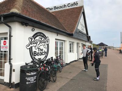 Jay Jay's This is a cafe 53 km from start 2m above sea level 3hrs39 at 14.4kmh Looking north-west You'll find Jay Jay's on the lower promenade, at beach level. It has outdoor seating and plenty of room for bikes.